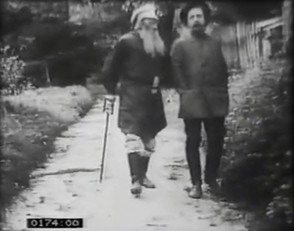 Another actuality shot has Tolstoy walking with Vladimir Grigoryevich Chertkov, described in a subtitle as "'chief' Tolstoyan." The Tolstoyans attempted to practice Tolstoy's religious and social ideas.